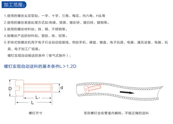 9、穩(wěn)定好用:在工作過程中,正常鎖完一顆螺絲,會自動送1顆到批嘴。扭力不足時,不送料到批嘴,避免卡料現(xiàn)象,即使因螺絲不良導致卡料,非專業(yè)人員也可以在幾秒鐘內解決卡料問題。